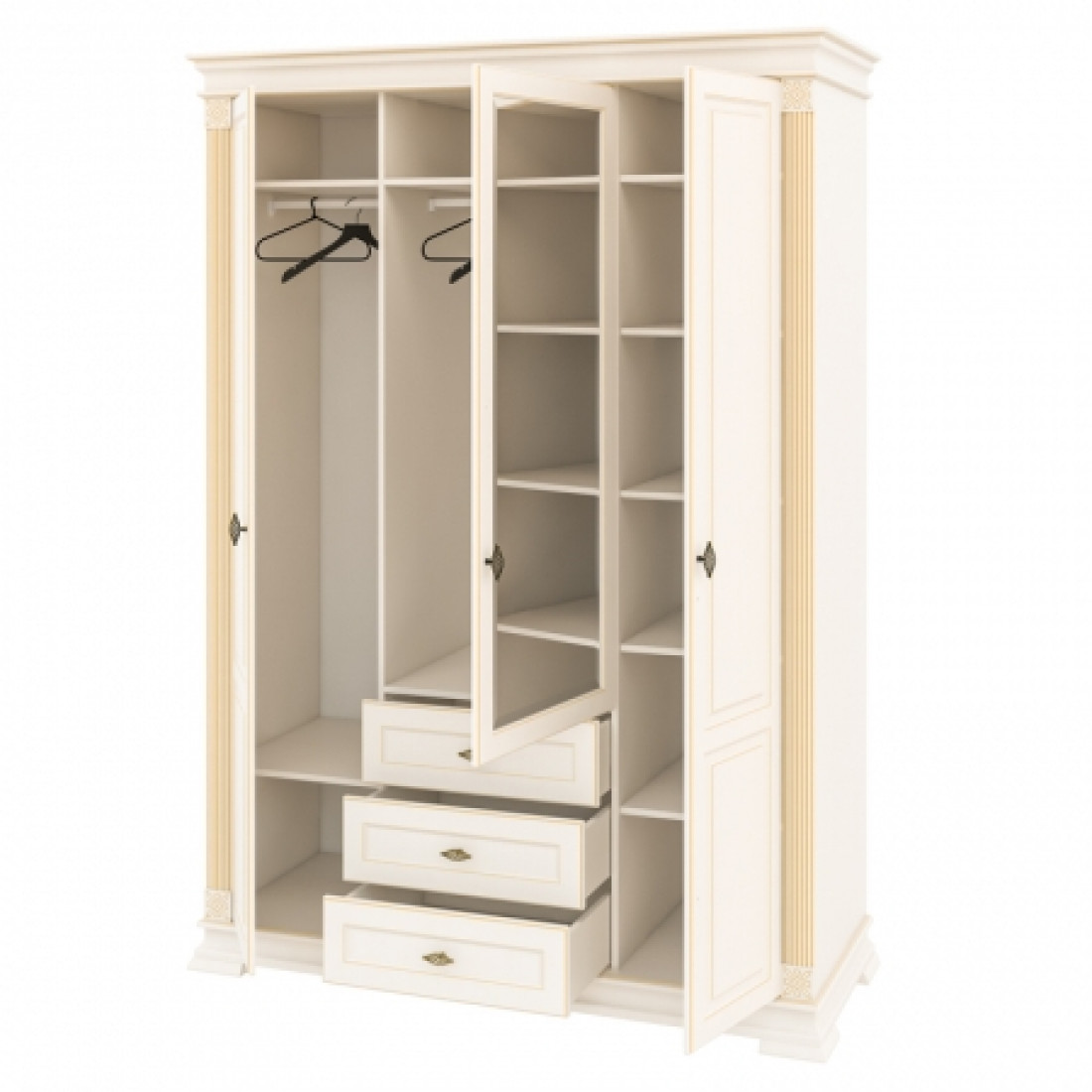 Роскошный трехстворчатый шкаф для одежды и белья МН-222-13 в спальню новой серии Афина (Мебель-Неман) выполнен в светлом кремовом оттенке с золотой патиной, является настоящим подарком производителя. Купить шкаф можно для комплекта полного спального гарнитура Афина с другими элементами серии или отдельно.