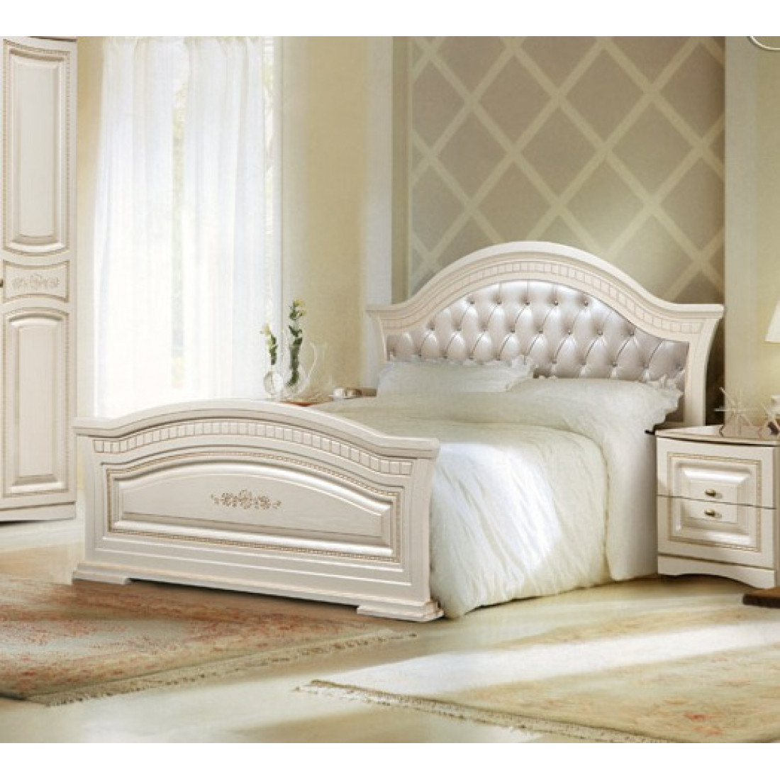 - Мягкое изголовье кровати (эко-кожа с каретной стяжкой стразами).